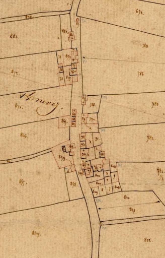 Le village en 1836. Extrait du cadastre de Berrien, section K 1 (A.D. Finistère, 3 P 78)Immatriculation