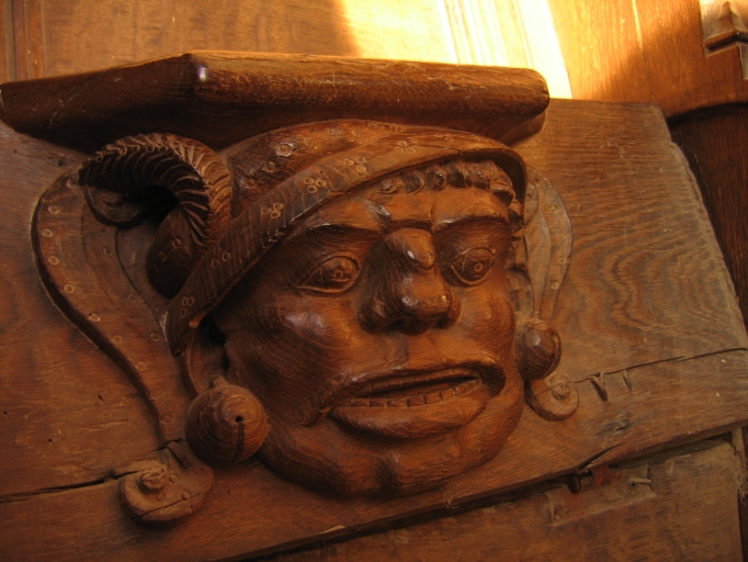 Plonévez-du-Faou, stalles de la chapelle Saint-Herbot : l'homme ici représenté appartient à un groupe de danseurs et de chanteurs mauresques, reconnaissables à leur costume caractéristiqueImmatriculation