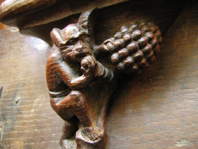 Miséricorde : détail de la tête de l'animal et du fruitImmatriculation