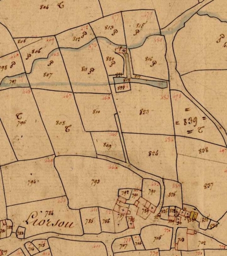 Le moulin de Liorzou. Extrait du cadastre de 1836, section D 3 (A.D.Finistère, 3 P 78)Immatriculation