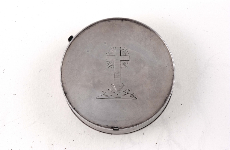 Vue générale de la boîte à hostie : croix gravéeImmatriculation