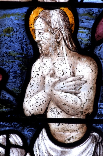 Verrière à personnages de la baie 3 : Paradis terrestre ; Enfance du Christ ; Baptême du Christ,