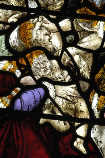 Verrière à personnages de la baie 3 : Paradis terrestre ; Enfance du Christ ; Baptême du Christ,