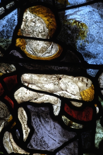 Verrière à personnages de la baie 3 : Paradis terrestre ; Enfance du Christ ; Baptême du Christ,