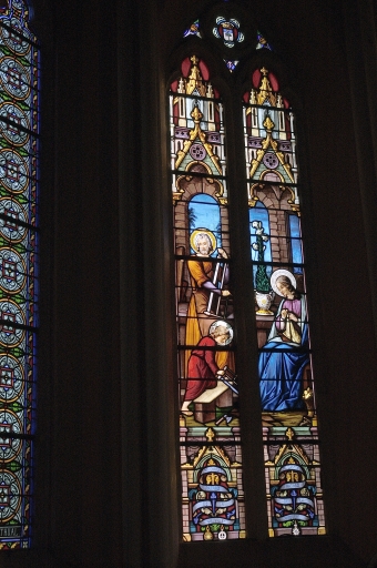 Ensemble des verrières à personnages des baies 0, 1, 2 : Sacrés Coeurs de Jésus et de Marie, Sainte Famille, Présentation de la Vierge au temple, et des verrières décoratives des baies 4 à 12,