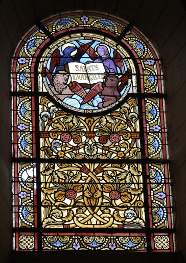 Verrière de la baie 109, symbole de l'Evangile : les quatre figures : le boeuf, le lion, l'ange et l'aigleImmatriculation