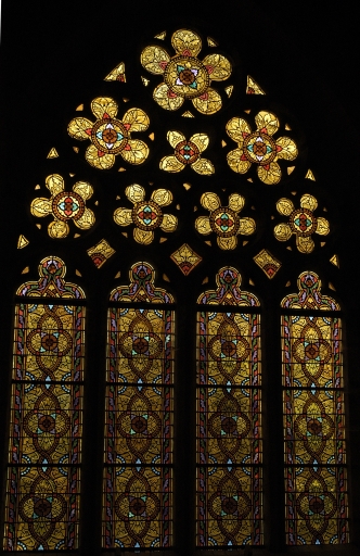 Ensemble des 30 verrières des baies 1 à 16, 18, 103 à 112, 113, 117 : Symboles des sacrements, Symboles des principaux dogmes de l'Eglise,