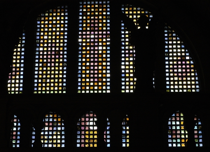 Ensemble des 30 verrières des baies 1 à 16, 18, 103 à 112, 113, 117 : Symboles des sacrements, Symboles des principaux dogmes de l'Eglise,