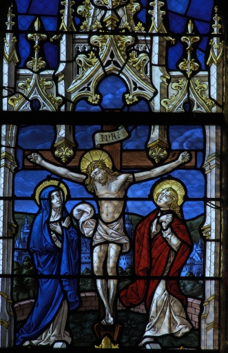 Verrière à personnages de la baie 108 (ancienne maîtresse-vitre) : Passion et Résurrection du Christ, Jugement dernier,