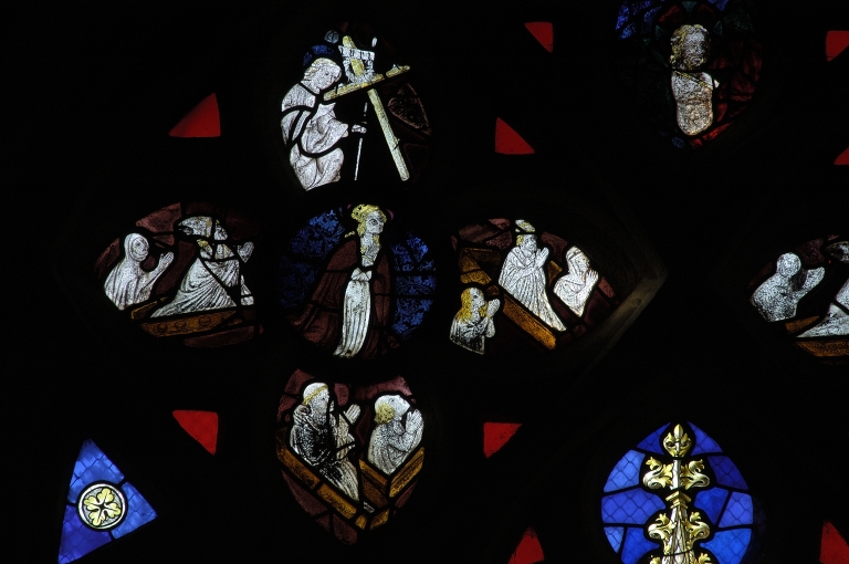 Verrière à personnages de la baie 108 (ancienne maîtresse-vitre) : Passion et Résurrection du Christ, Jugement dernier,