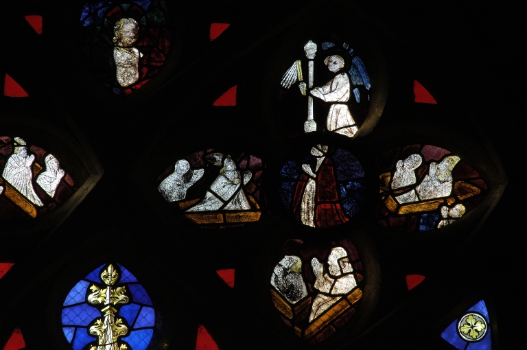 Verrière à personnages de la baie 108 (ancienne maîtresse-vitre) : Passion et Résurrection du Christ, Jugement dernier,