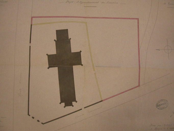 Projet d'agrandissement de cimetière, 1882. En rose, le mur à construireImmatriculation