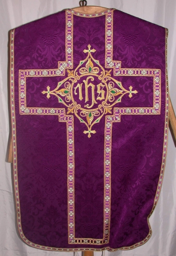 Ornement violet 3 : chasuble, bourse de corporal, étole, manipule, voile de calice,