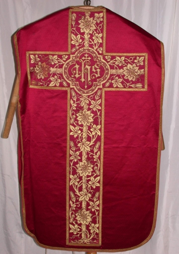 Ornement rouge 1 : chasuble, bourse de corporal, étole, manipule, voile de calice,