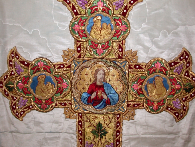 Ornement blanc 3 : chasuble, bourse de corporal, étole, manipule, voile de calice,