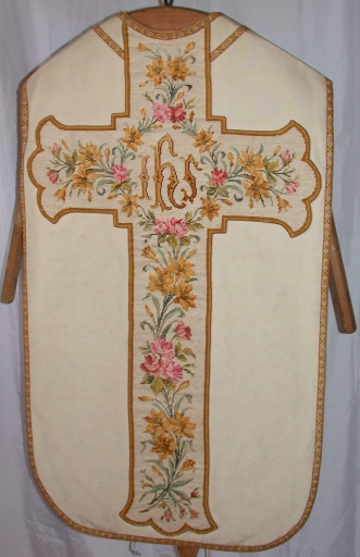 Ornement blanc 6 : chasuble, bourse de corporal, étole, manipule, voile de calice,