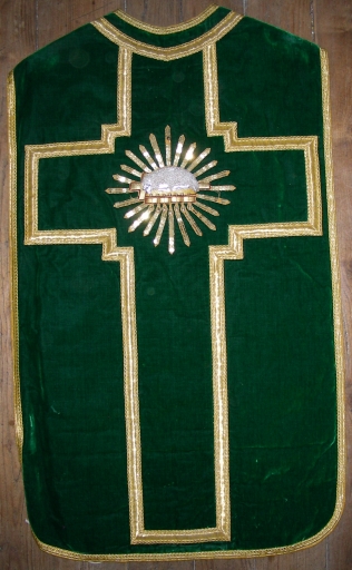 Ornement vert 1 : chasuble, étole, manipule, voile de calice et bourse de corporal,