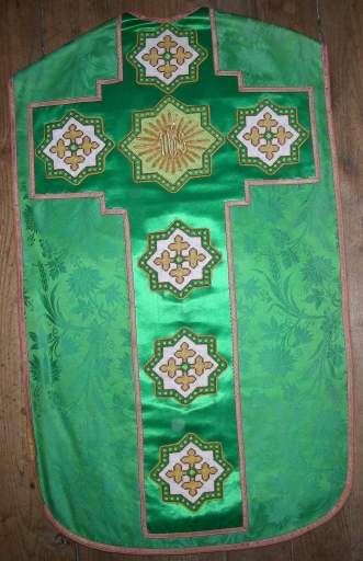 Ornement vert 2 : chasuble, étole, manipule, voile de calice et bourse de corporal,