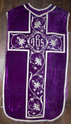 Ornement violet 1 : chasuble, étole, manipule, voile de calice et bourse de corporal,