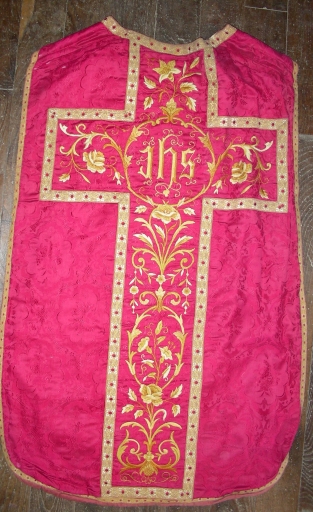 Ornement rouge 1 : chasuble, étole, manipule, voile de calice et bourse de corporal,