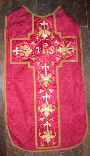 Ornement rouge 3 : chasuble, étole, manipule, voile de calice et bourse de corporal,