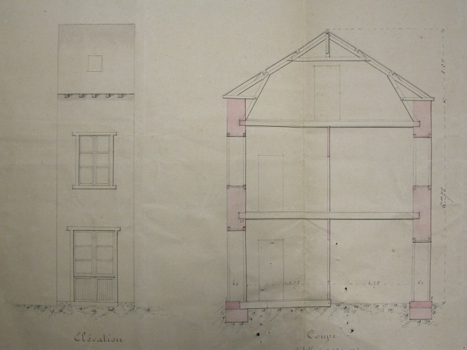 Plan manuscrit. Annexe à la maison d'école des garçons. Elévation et Coupe. 1882Immatriculation