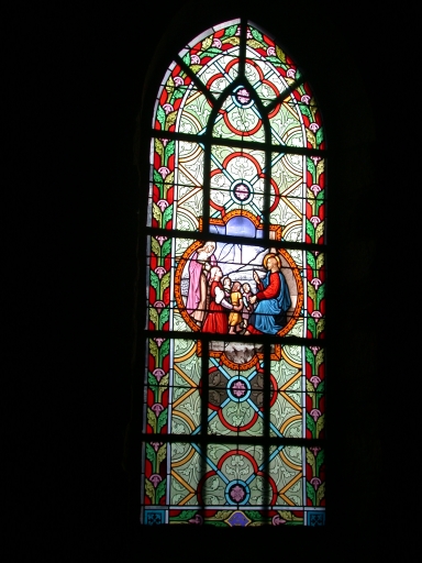 Verrières à personnages des baies 3 et 4 : Sainte Famille, Jésus bénissant les enfants et verrière décoratives des baies 1, 2, 5, 6, 00,