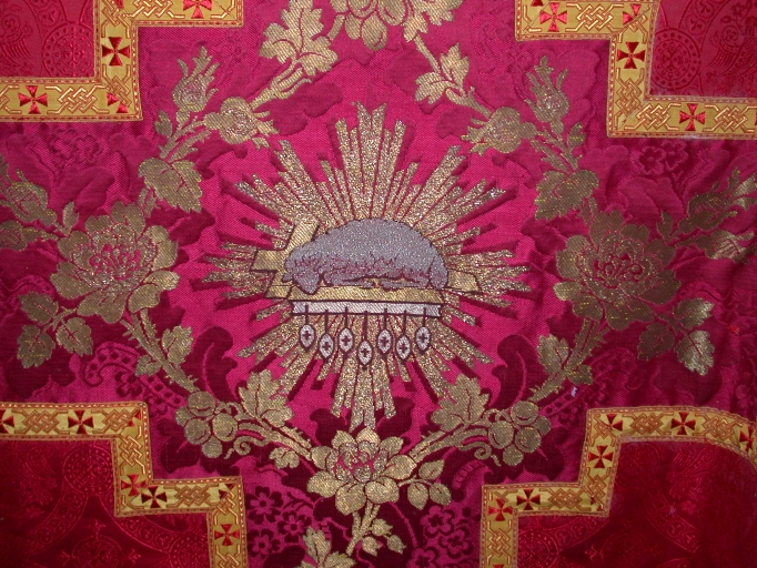 Ornement rouge 3 : chasuble, bourse de corporal, étole, manipule, voile de calice,