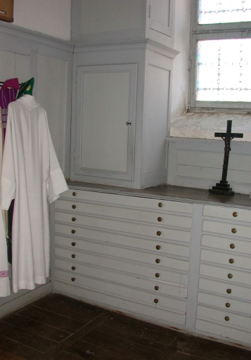 Meubles de sacristie : chasublier, armoires, confessionnal, lambris de demi-revêtement,