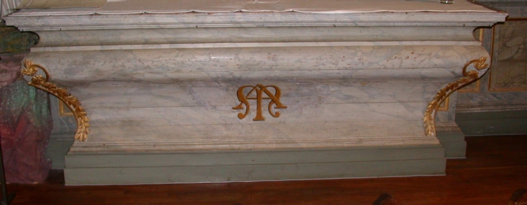 Ensemble de l'autel de la Vierge : autel, retable, 3 gradins d'autel, 2 degrés d'autel,