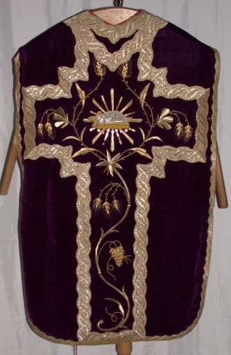 Ornement violet 1 : chasuble, bourse de corporal, étole, manipule, voile de calice,