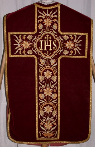 Ornement rouge 3 : chasuble, bourse de corporal, étole, manipule, voile de calice,