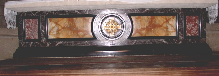 Ensemble 2 du maître-autel : autel, tabernacle, gradin d'autel, retable, baldaquin d'autel, 3 degrés d'autel, 4 statues d'anges,