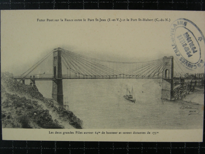 Carte postale ancienne, dessin du futur Pont sur la Rance, par J. Lebrun, novembre 1913. (A.D.Ille-et-Vilaine : 6Fi)Immatriculation