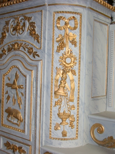 Tabernacle, 'panoplie' de droite : ostensoir, étole, croix, lampe de sanctuaire, vigneImmatriculation