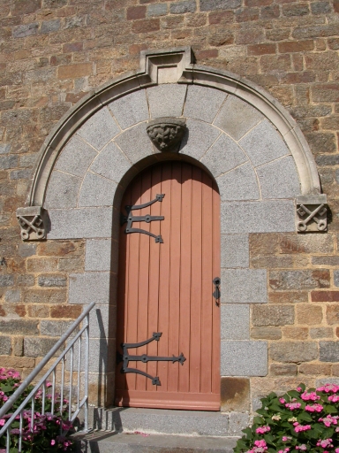 Elévéation est : détail de la porte avec socle de statue en réemploi de l'ancienne égliseImmatriculation