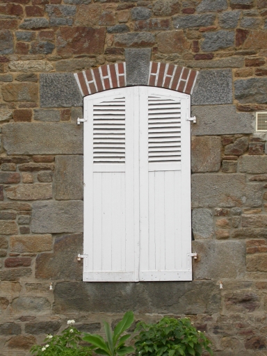 Façade sud-est : détail d'une fenêtre du rez-de-chaussée avec pierres d'encadrement réemployéesImmatriculation