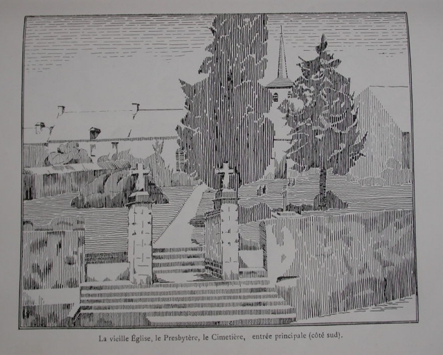 Dessin de Gustave Bénic : entrée principale (côté sud) de l'ancien cimetière ; au fond, l'ancienne égliseImmatriculation
