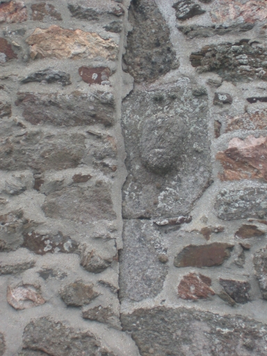 Détail, pierre avec tête sculptéeImmatriculation