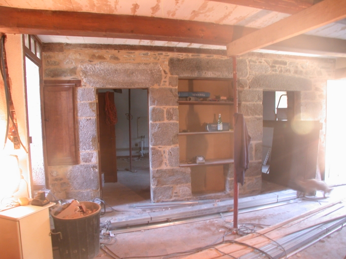 Vue intérieure. Mur avec vaisselier mural encadré de deux portes, celle de gauche menait à un cellier, celle de droite à une chambre.Immatriculation