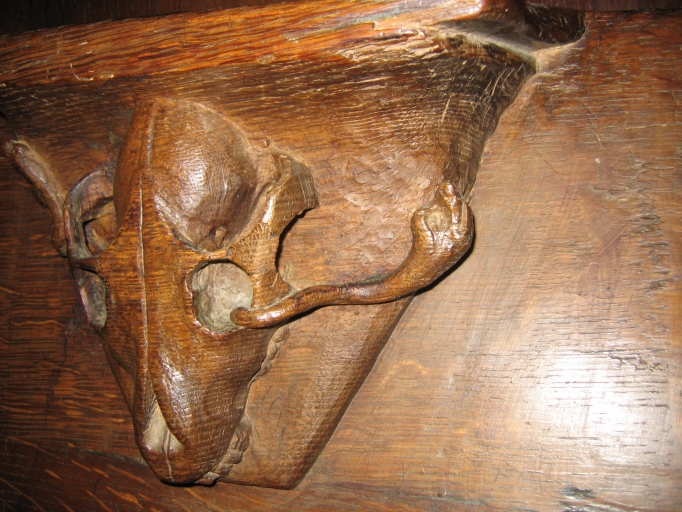 Miséricorde : détail du bucrane et du ver sortant de l'orbite.Immatriculation
