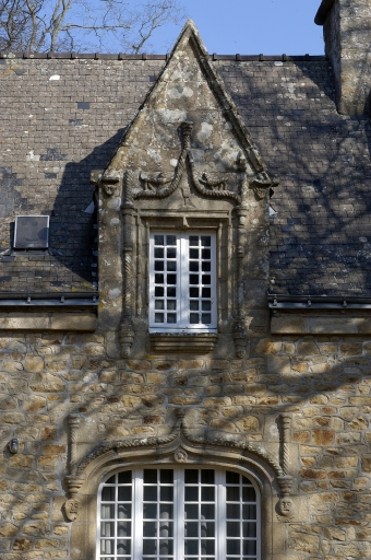 Maison de gardien, construite dans les années 1930, à partir des vestiges d'une ferme du 16e siècle, de Kerdelame en Locoal-Mendon : détail.Immatriculation