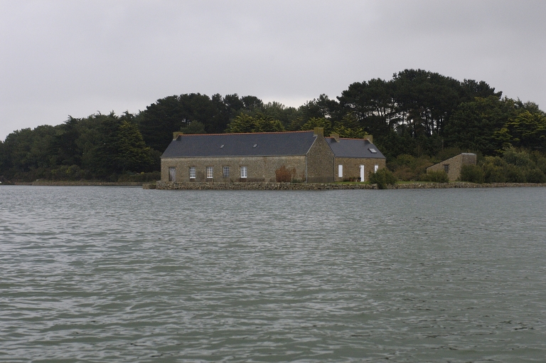 Pointe de Levein, chantier ostréicole vu depuis la rivière. Au premier plan l'atelier, perpendiculaire à l'arrière, la maison du gardien.Immatriculation