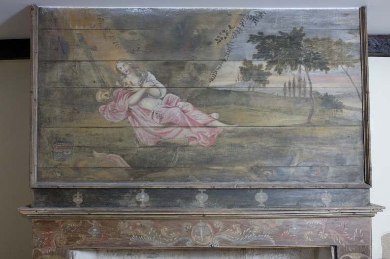 Le logis : la chambre ouest, détail du décor peint sur la cheminée boisée, représentant Marie-Madelaine au désert.Immatriculation