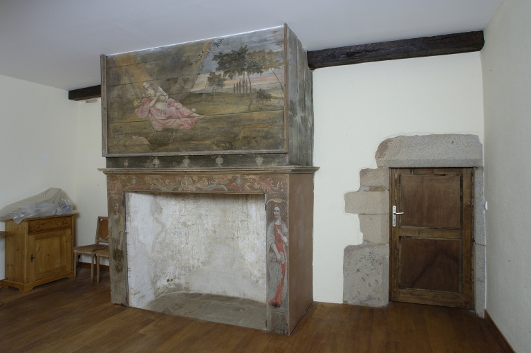 Le logis : la chambre ouest, vue générale sur la cheminée et la porte donnant accès à la garde-robe (17e siècle).Immatriculation