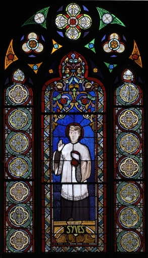 Ensemble de 9 verrières figurées : Sainte Hélène ; Saint Yves ; Immaculée conception ; Sacré-Coeur ; Saint Jean-Baptiste ; Notre-Dame de la Salette ; Saint Mathurin ; Saint Pierre ; Saint Joseph,