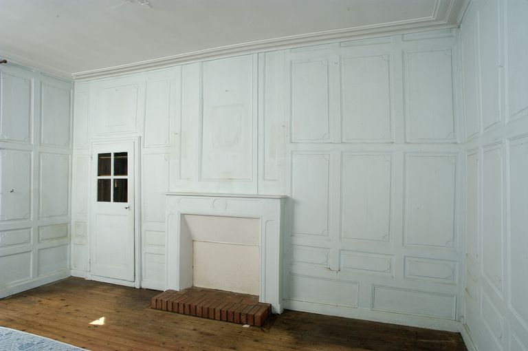 Etage, chambre ouest, lambris et cheminée du mur ouest.Immatriculation