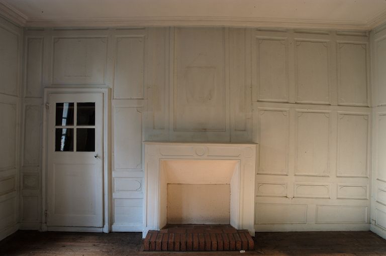 Etage, chambre ouest, lambris et cheminée du mur ouest.Immatriculation