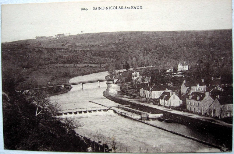 Saint-Nicolas. Vue prise de de Castennec : la gare, le pont de chemin de fer, l'écluse et la maison éclusière. Carte postale ancienne. AD Morbihan, 9 Fi.Immatriculation