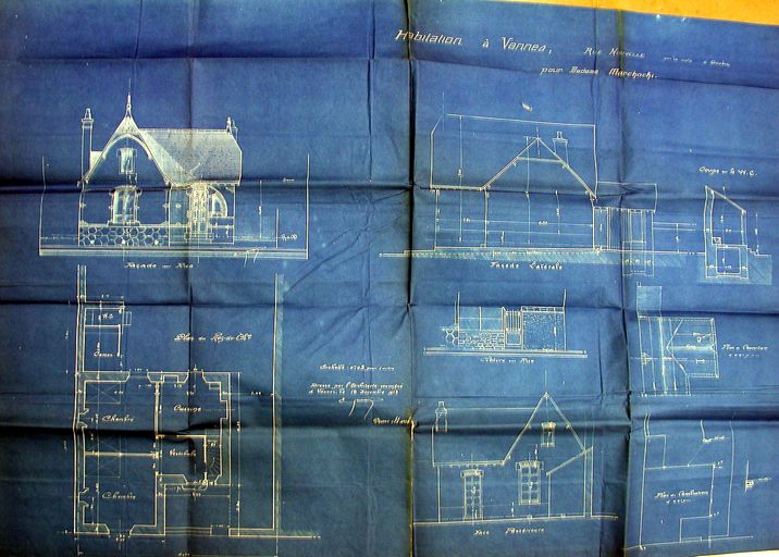 Elévations et plans au sol de la maison Marchocki par Gemain, 1913. AM Vannes 5I162.Immatriculation